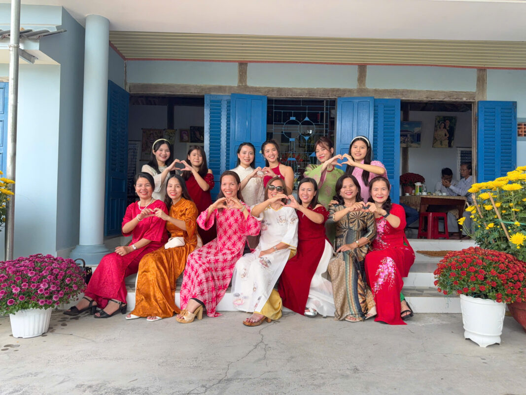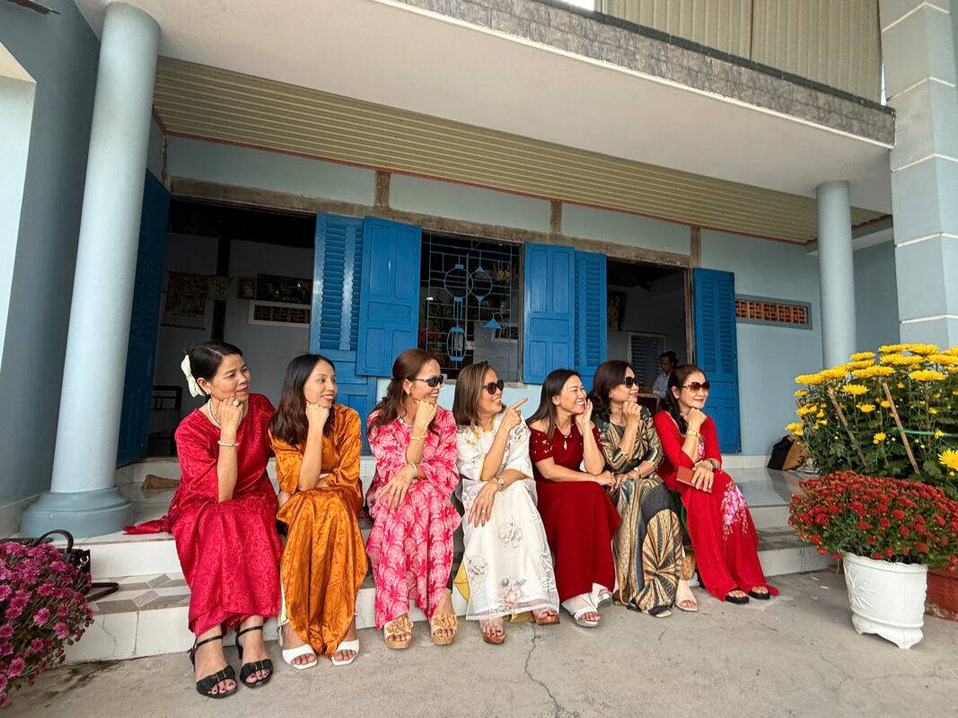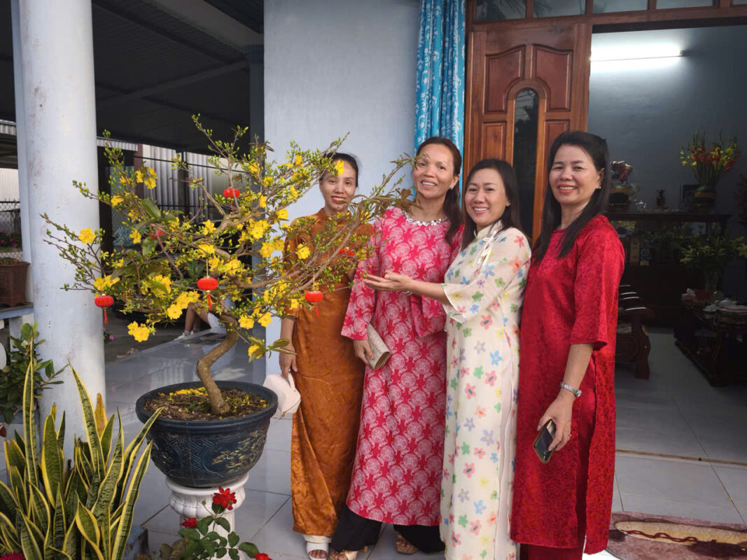 Giữa những con đường làng quen thuộc, rợp sắc hoa ngày Tết, hình ảnh các chị, các mẹ, các em duyên dáng trong tà áo dài truyền thống đã tạo nên một khung cảnh vừa mộc mạc, vừa rực rỡ. Không cần sân khấu lộng lẫy, chính nền trời xanh, những mái nhà yên bình và nhịp sống chậm rãi của miền quê lúa non trù phú đã trở thành phông nền hoàn hảo cho bộ ảnh đầu xuân.