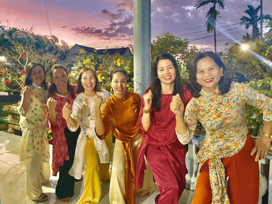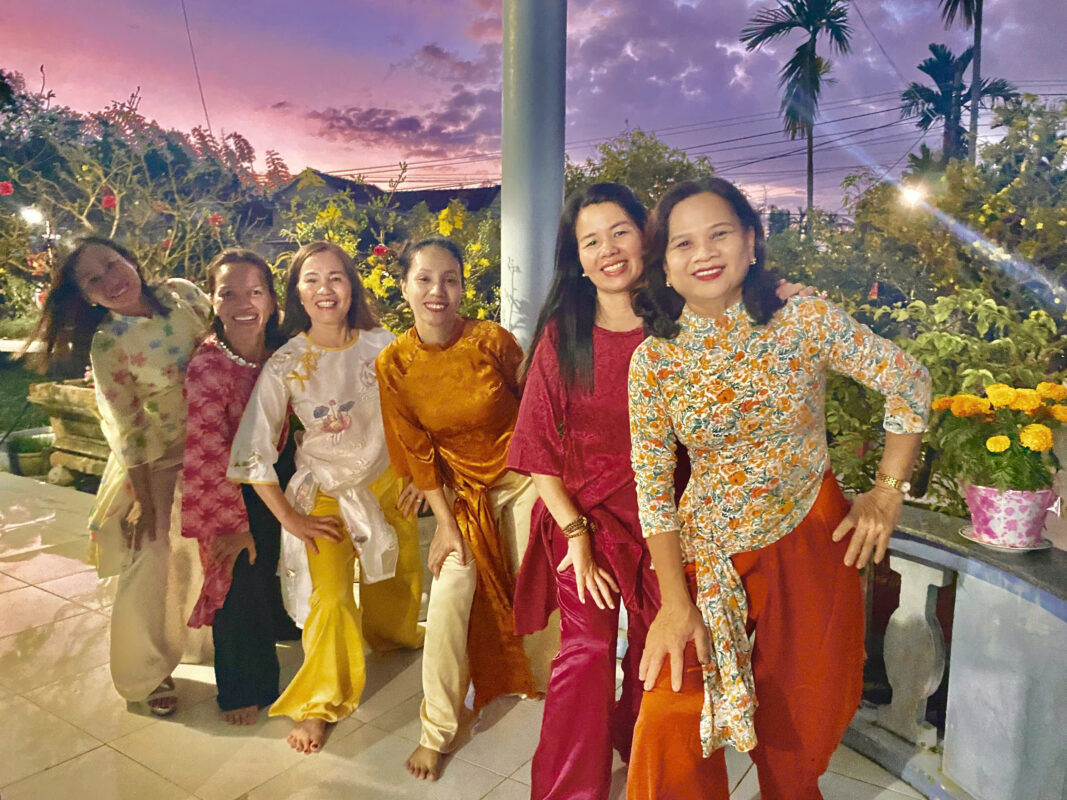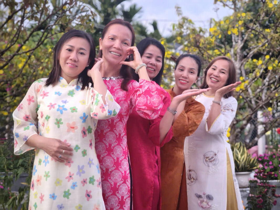 Trong tiết trời hanh nắng nhẹ, bầu không khí trong lành và dịu êm của miền quê đầu xuân, phụ nữ phái đẹp nơi đây đã cùng nhau khoác lên mình những tà áo dài rực rỡ sắc màu, ghi lại những khoảnh khắc đáng nhớ giữa không gian làng quê trù phú. Từ sắc đỏ may mắn, vàng tươi phú quý đến xanh ngọc dịu dàng hay tím thủy chung, mỗi tà áo dài như một đóa hoa xuân góp phần làm nên bức tranh Tết sống động và đầy cảm xúc.