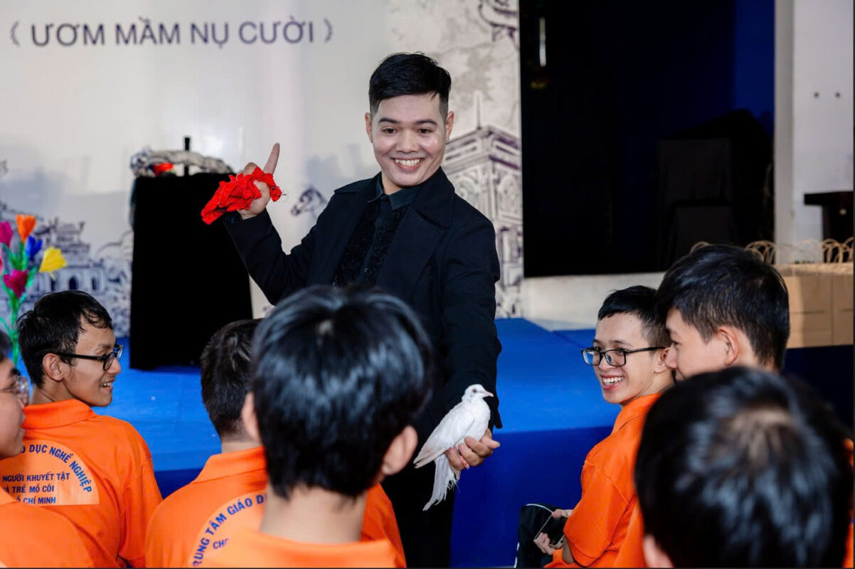 Tiết mục ảo thuật đặc sắc mang đến không khí vui tươi, thu hút sự hào hứng của các em nhỏ khuyết tật.