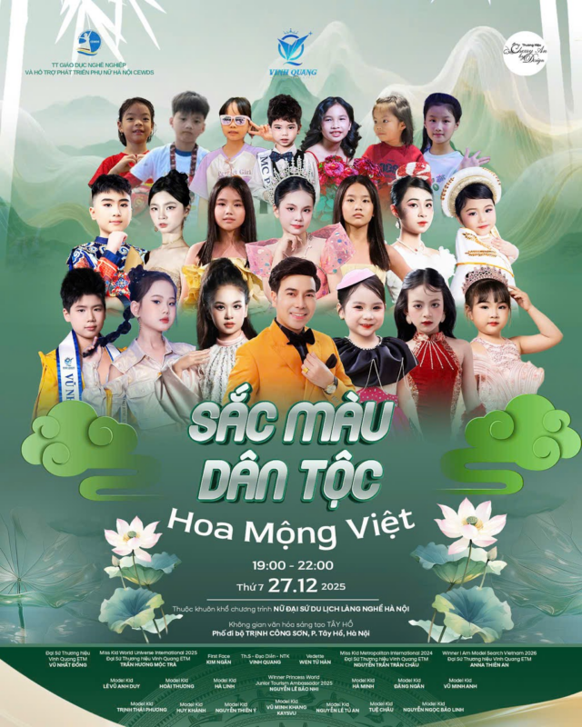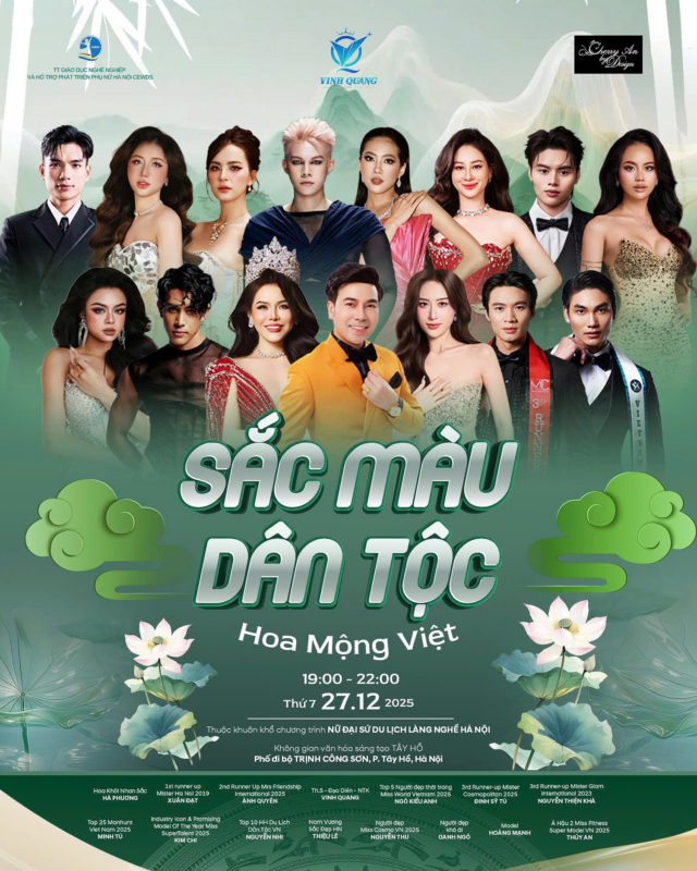 Ngày 27/12/2025 tới đây, tại Phố đi bộ Trịnh Công Sơn (quận Tây Hồ, Hà Nội), Fashion Show Sắc Màu Dân Tộc sẽ chính thức diễn ra. Chương trình do Trung tâm Giáo dục Nghề nghiệp và Hỗ trợ Phát triển Phụ nữ Hà Nội (CEWDS) phối hợp cùng Huyền Trương Fashion Show tổ chức, hướng đến việc tôn vinh vẻ đẹp văn hóa dân tộc thông qua ngôn ngữ thời trang, đồng thời tạo sân chơi kết nối cho các gương mặt người mẫu ở nhiều độ tuổi.