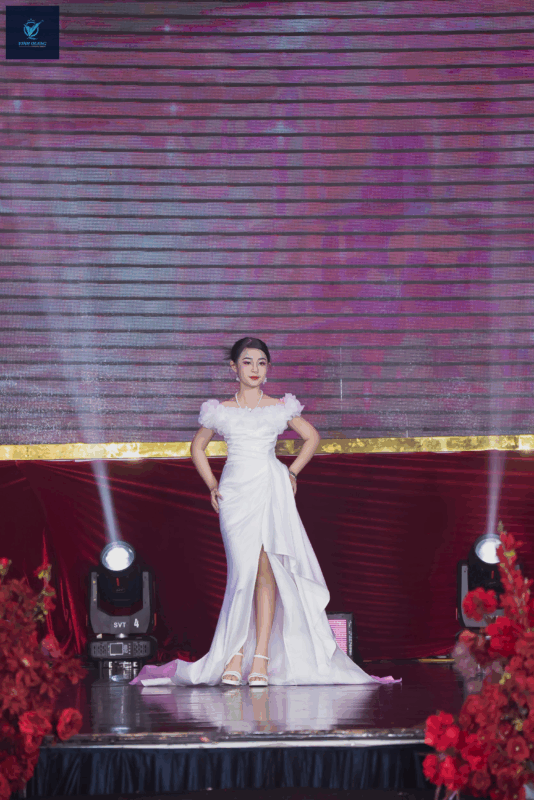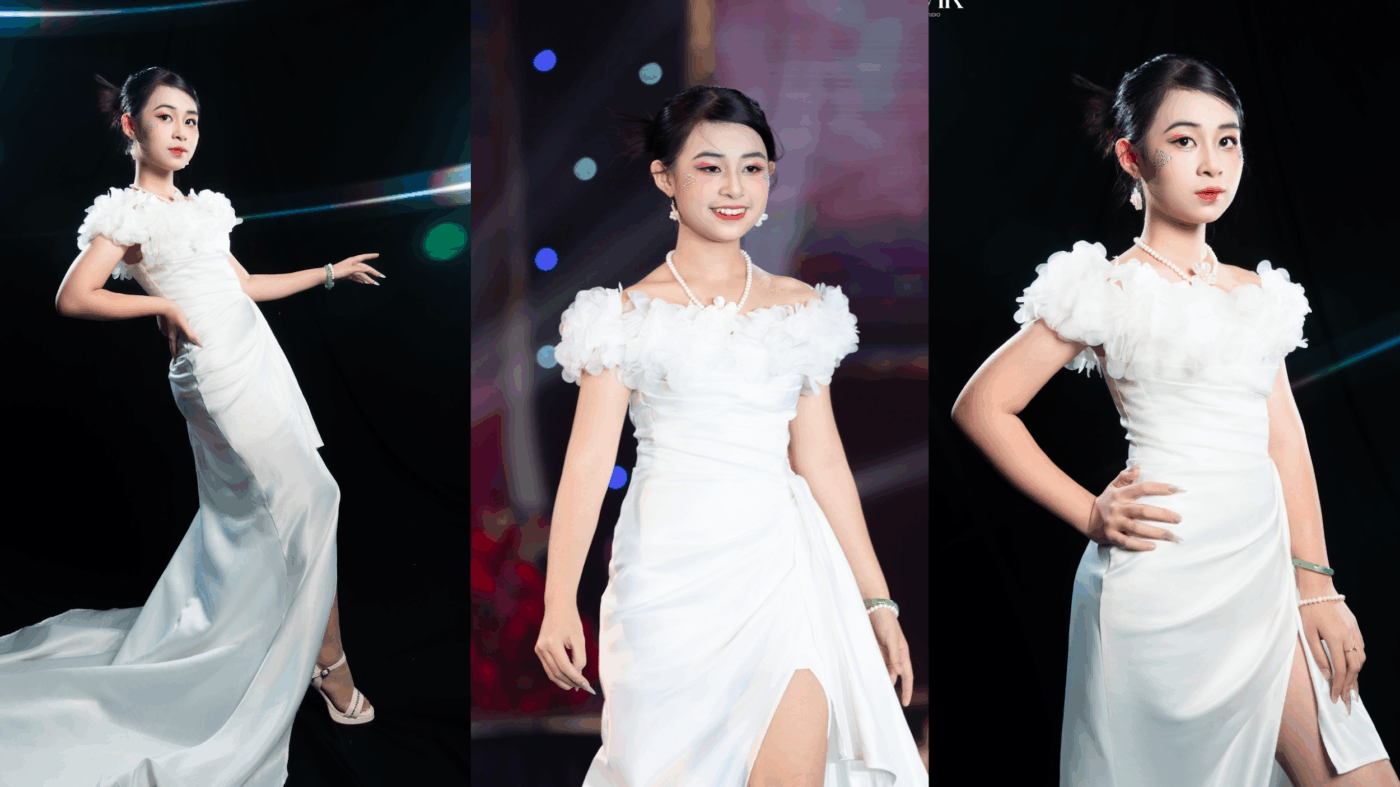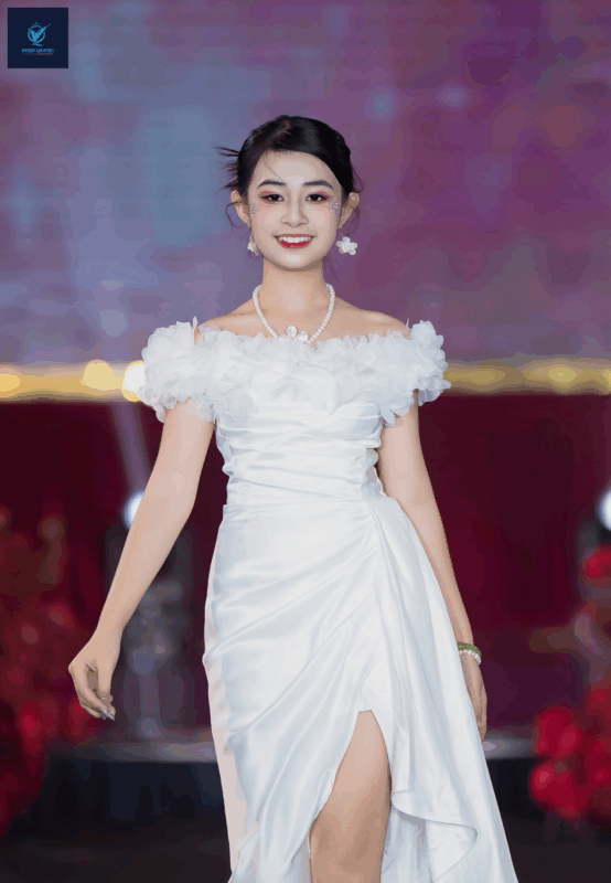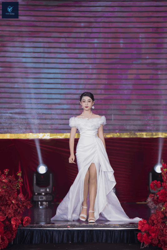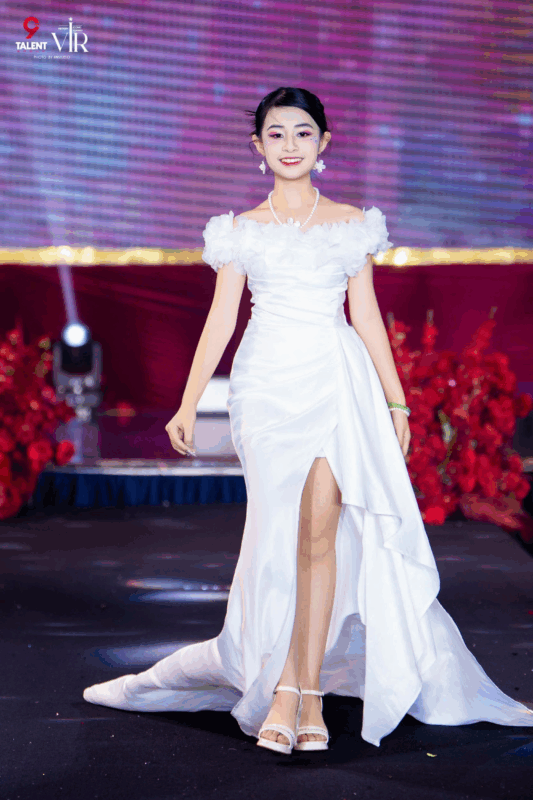 Trong BST Shine, Đăng Ngân diện chiếc đầm trắng tinh khôi được thiết kế tỉ mỉ, với phần vai bồng mềm mại như mây trời, kết hợp cùng chi tiết cắt xẻ khéo léo ở tà váy. Thiết kế vừa gợi nét thanh thoát, trẻ trung đúng lứa tuổi, vừa mang lại vẻ quyến rũ, sang trọng – thể hiện trọn vẹn tinh thần của BST. Trên sàn runway, bộ trang phục như được “thổi hồn” nhờ thần thái và phong cách trình diễn đầy cảm xúc của Đăng Ngân.